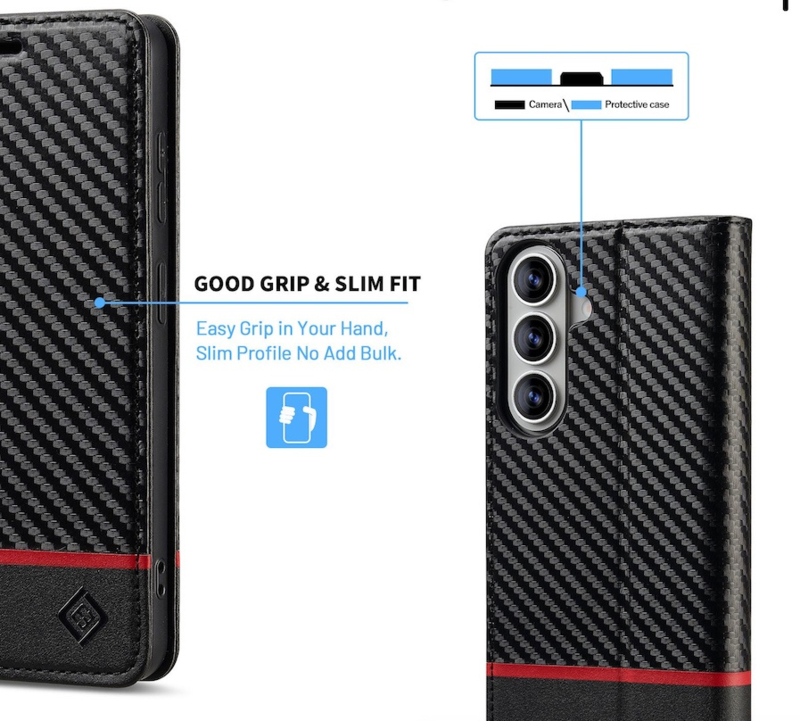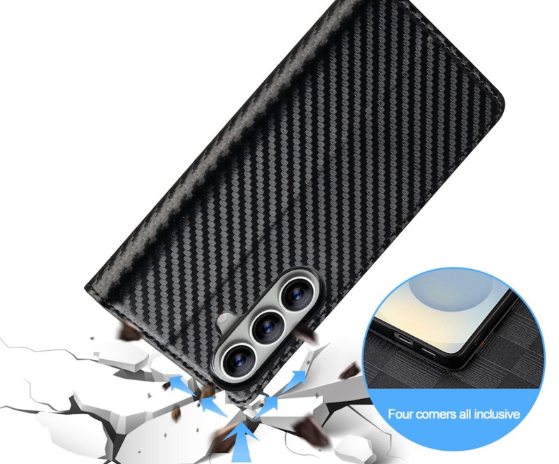 Dit luxe carbon boek stijl etui beschermt uw Galaxy perfect tegen krassen, beschadigingen en bij vallen. Ideaal voor een goede bescherming bij dagelijks gebruik en met een stijlvol carbon-motief. Met handige vakjes voor 3 passen en een vakje voor wat geld of visitekaartjes.